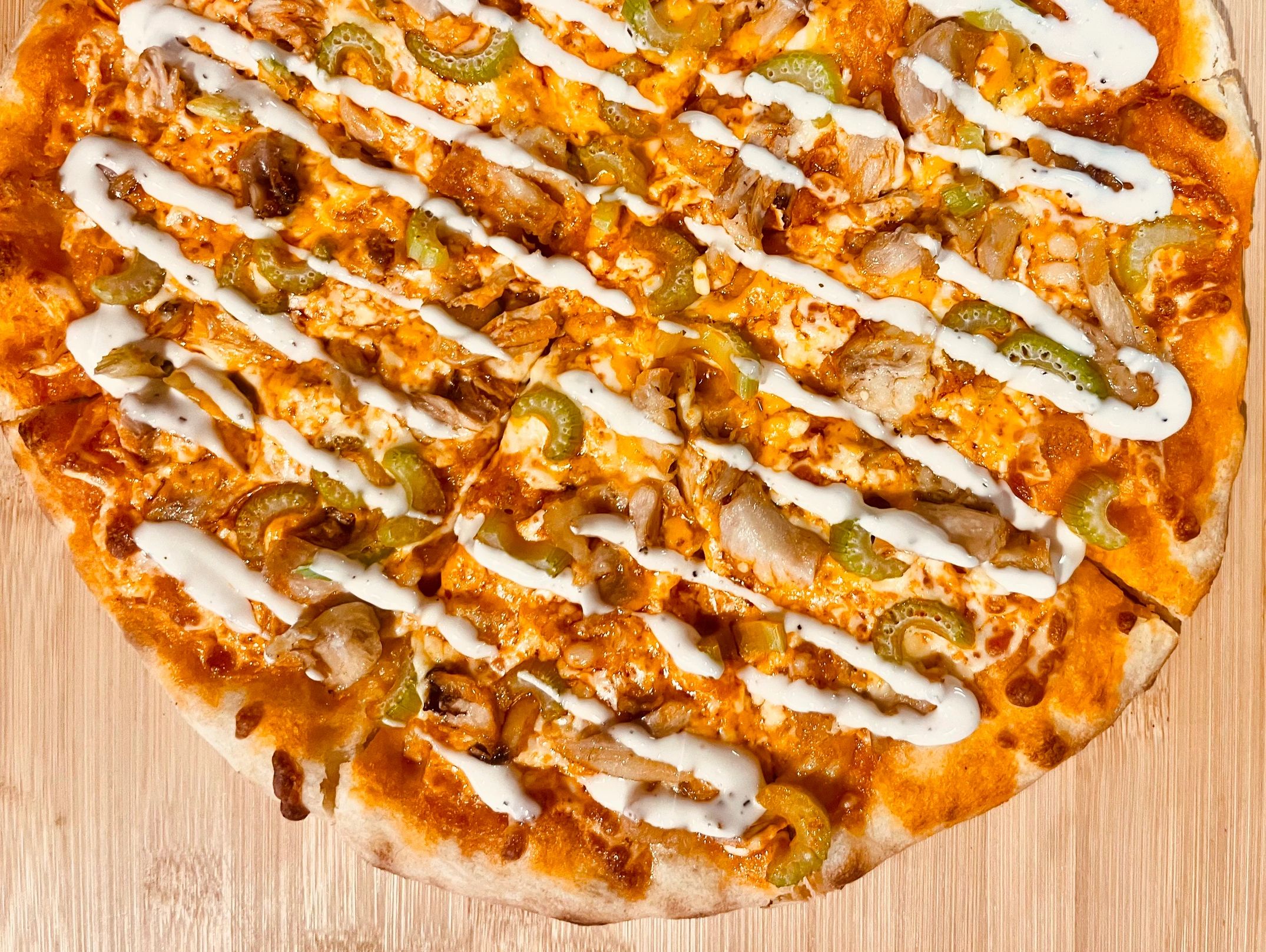 Olive oil base, bacon, jalapeño, crispy pickles, onions, topped with dill ranch, garlic butter crust, mozzarella